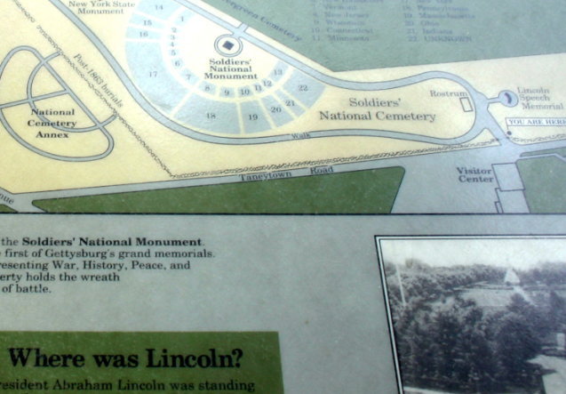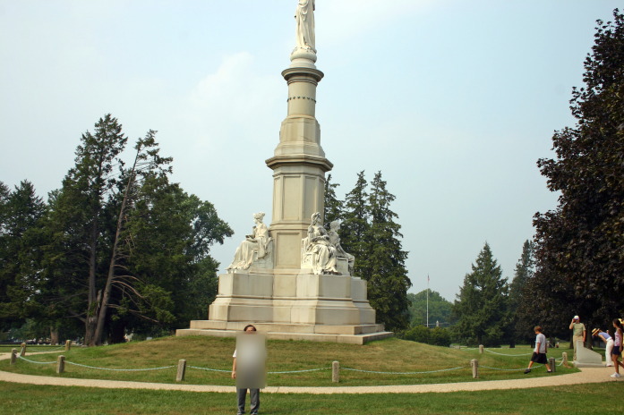 リンカーンがスピーチしたのは、写真を撮ったところではなく、「Soldiers' National Monument」の傍だという。「ここまできたら後悔したくない。」と思って、バス出発まであと8分ほどだったが、上の園内の地図を頼りにとにかくもう一度墓地公園内に駆け込んで下のSoldiers' National Monumentのところで、また「Government of the people・・」とやり、別の中年男性に撮ってもらった。ただし、「Government of the ・・」と言ったところで「カシャ」だったけれど。