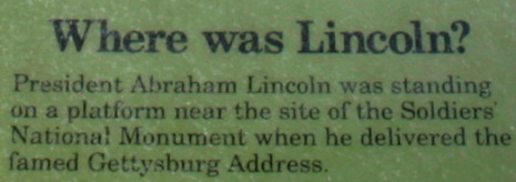 ところが午後まず連れて行かれたのはゲティスバーグの町中の古い家で、その見学に1時間もとった。興味がなくはないが、最大目的がリンカーン演説の地だから、正直「早く終わってくれ。」と思っていた。やっと終わったと思ったら「これから50分間自由行動」となった。私はガイドの「行く。」の言葉を信じて、「最後に行くのだろう。」と考え、町中をぶらぶらして時間を潰した。 そしてまた迎えに来たバスに乗って最後に降ろされたのは博物館の前だった。また「自由行動」という。今度ばかりは焦って、ガイドに「リンカーンの演説の地には行かないのか?」と聞くと、ガイドは道路の反対側を指差して「あそこだ。」と言った。そこは公園のような北軍の戦死者を埋葬するための墓地であった。結局「行く。」というのは近くに行く、ということで、見たい人は自由に見なさい、ということだったのだ。