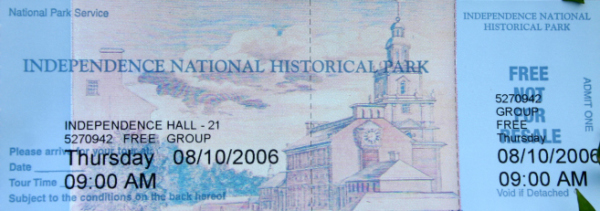 独立宣言を採択したインディペンデンス・ホール。ペンシルベニア植民地の議事堂であった。この中には、ツアー参加でないと入れなかった。この建物を含めて「歴史公園」となっていて、そこに「ビジター・センター」がある。朝8:30から無料で内部ツアーのチケットを配る。ツアーの参加時間は選べるが1:00までにはもう配分が終わるようだ。私は8:00ころ行ったが、もう40名近く並んでいた。でも一番早い9:00のコースを取れた。下にそのチケットを示すが、結構人気があるので早めに並ぶのがいい。時間前に左手のところに行きセキュリティ・チェックを受ける。ベルトまではずされてチェックされた。