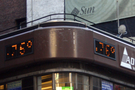 これは、私たち現代日本人にはなじみのない「華氏」での温度表示のためだ。「華氏」とは18世紀初めのドイツ人のファーレンハイト(中国で華倫海と表記された)が定めたもので、当時最低温度と考えられていた、氷に塩をまぜて得られる温度を0度とし、人間の体温を96度として等分したもので、暑い日の気温が100度となってわかりやすいことに利点があるとのこと(エンカルタ百科事典より)。なじみの摂氏温度もほぼ同時に示されていた。USAスケッチへ