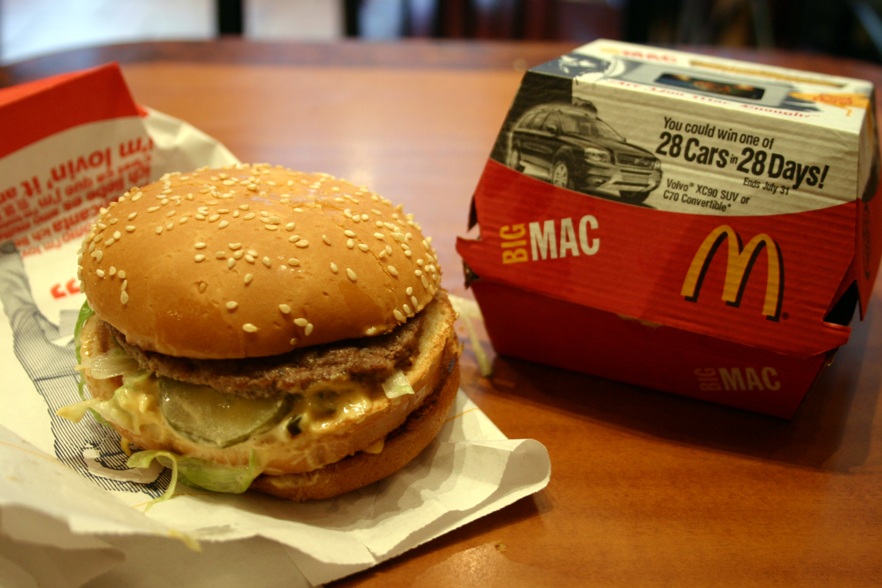 USAに行って食べたかったものの一つにマクドナルドのハンバーガーがありました。ニューヨークのエンパイアステート・ビルディングの入口前の店に入りました。以前写真で見たことがある右のようなとても大きなものを食べ切れなくても注文したいと思っていましたが、この写真は見かけ倒れで、現実は下のようなものでした。聞いたらこの「big mac」だけだそうで、99セントと安かったのだけはよかったです。