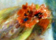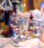 近くでよく見ると若い女性の帽子の赤い飾りと机上の透明さの際立つグラスにたくさんの絵の具が重ね塗りされていました。塗りこんだだけその部分が私たちを惹きつけるのですね。