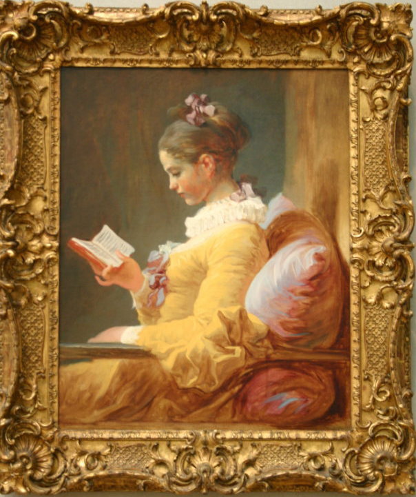 みやげ物ショップでその絵の葉書を買い、ついに全体のサービス・センターへ行き「この絵はどこだ?」と質問。回答は「今ドイツの博物館に行っている。」でした。がっかりしましたが、そのみやげ物絵葉書の中に下のお気に入りの絵を見つけたので「これは?」と聞くと「それは間違いなく△△室にある。」と言うので、行ったらありました!! フラゴナールの「読書する娘(少女)」です。恥ずかしながらこれがこの美術館にあることを知りませんでした。椅子からちょっと遠くて立ったままの鑑賞となりましたが、知らずにいきなりすばらしいものに出会ったという感動が味わえて「ここに来て良かった」と思いました。