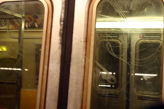 かつてニューヨークの地下鉄車両への落書きはひどいので有名だった。しかし、技術進歩により、落書きがしにくくすぐ落とせる金属の開発・採用で車体金属への落書きは減った。しかし、このようにガラスを傷つける「落書き」が目に余った。