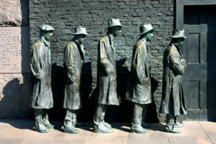 大恐慌で国民の1/3が飢えや貧困生活に苦しんだ時代の雰囲気を示す彫刻群が置かれている。左は苦悩する農民の像、右は無料のパンの列に並ぶ失業者たちの像。