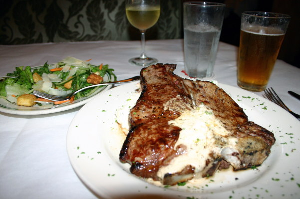 メニューを見ると、いくつもあり迷いましたが、「Aged beef」という説明が付いている(と私が勝手に理解した)ものがいくつかあり、その中で一番高いのが28$の「Porter house」で、英語の言い方は忘れましたが何か「自家製のバター付き」というのでした。「どうせ食べるなら一番高いのがいいはず。」と思いこれをミーディアムで注文しました。そしてビールとワイン(赤ワインの銘柄を頼んだつもりがなぜか白が出された!?)も。サラダも頼み先に出てきたので軽く食べて飲んでいると下のようなステーキが出されました。思わず「うぉーっ!」と叫びました。日本で普通ステーキとして思い浮かべるもののサイズの2〜3倍以上はありました。頼まなかったせいかパンが出てこないので、ひたすらナイフで切り肉を食べまくりました。添えられていたバターはやや塩辛いものですが、私には好みの味でした。