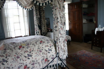 母屋の寝室。リビングルームはウィリアムズバーグのページに載せた。右は屋敷の北東中庭から見たところ。左手の母屋から屋根つき廊下でつながり、キッチン、洗濯場、奴隷部屋がある。