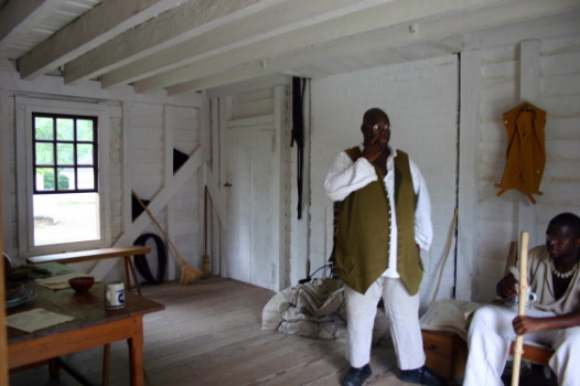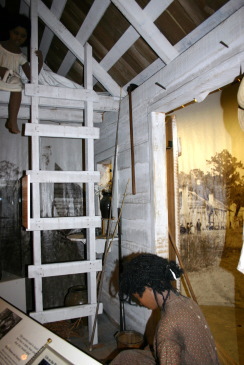 家事労働に従事させられた黒人奴隷の部屋と奴隷を演じ説明するスタッフ。なんとか聞き取った説明によると、窓にガラスがあり、板敷きの床で、さらに暖炉もあり、奴隷としてはいい方の待遇だとのこと。奴隷といっても様々な待遇があったことを学んだ。
