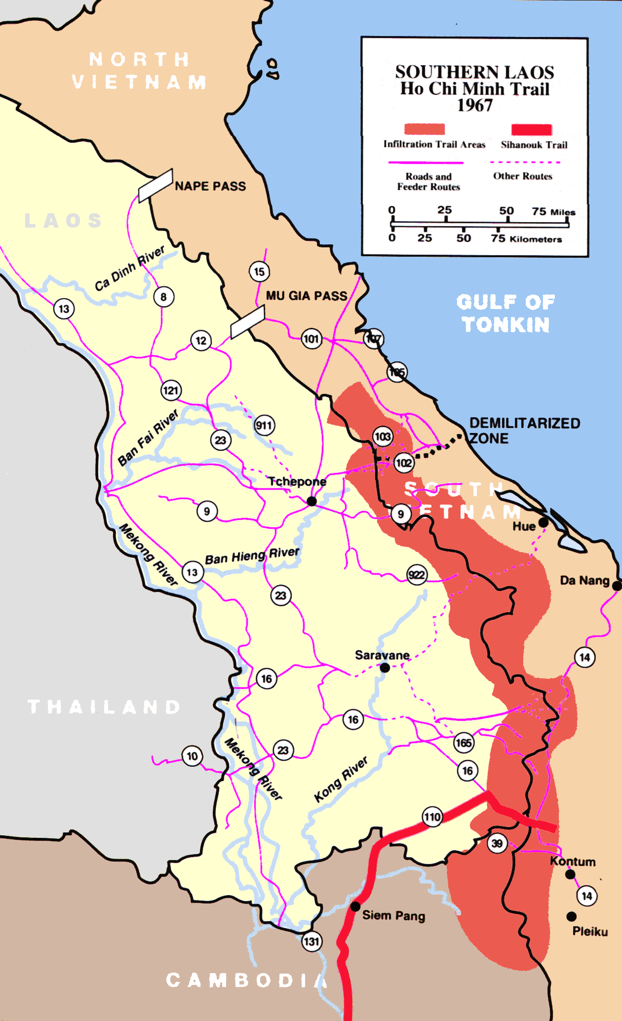 中央の朱色の太線が「南ベトナム進入ルート」(1本の道でなく、多くの道が使われているため)。赤線がカンボジアを通るシアヌークルート。ピンク線は支線。