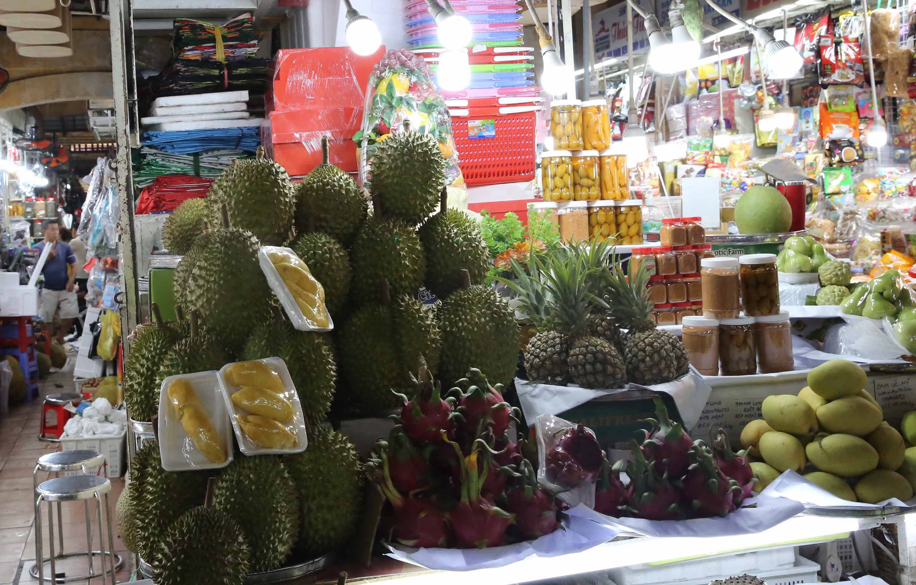 ベンタン市場に並ぶドリアンなどの南国の果物