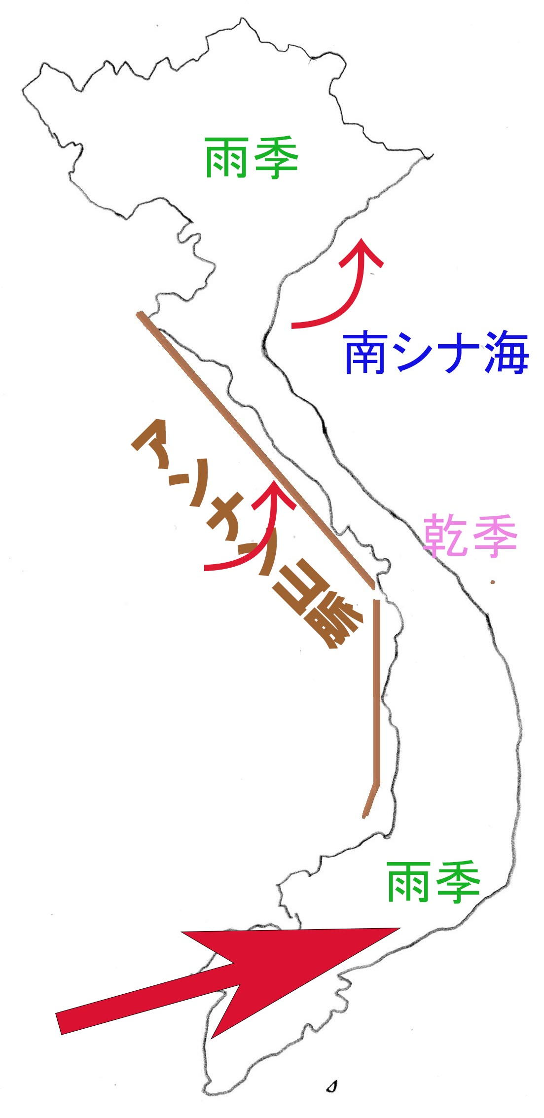 すなわち、「11月から4月にかけては、中国の内陸から冷たいかわいた北東風がベトナム北部にふきこみます。ところが中部に向かう風は、南シナ海の上を通るので多くの水分を吸い込み、・・・山脈にぶつかって風上の中部沿岸に雨を降らせ、この地方を雨季にします。そして、山脈の風下にあたる南部では乾季になるのです。・・・一方、5月から10月までは、高温で湿った南西風が、インド洋からシャム湾を通って・・・山脈の手前のベトナム南部にふきつけ、雨を降らせます。この風はさらに、南シナ海やトンキン湾で再び水分を吸収し、・・・南南東の風となってベトナム北部にふきこみ、・・・蒸し暑い雨季にします。」(『目で見る世界の国々164 2東南アジア』TBSブリタニカ p.29)![]()
