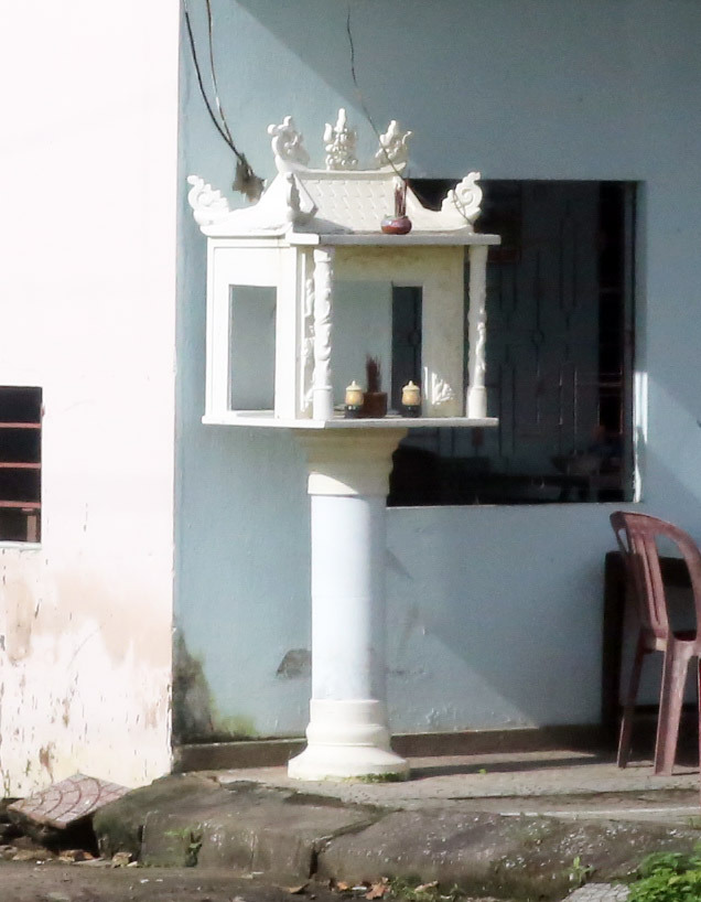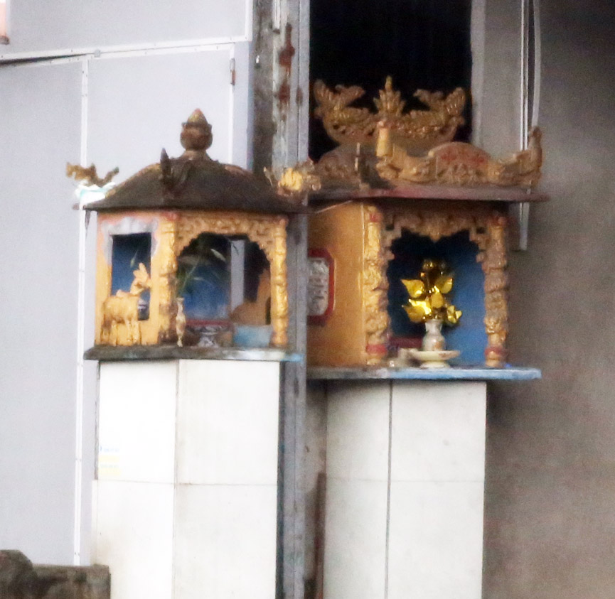 フエを中心とした地域で、下の写真のような小さな祠が各家の前に置かれているのを見た。私はタイで同様なものを見たことがあり、タイでは中に老夫婦の人形を土地神として入れて祀り、土地の守護を祈っていることを知った。初めは、タイ人がこの辺に移住して来たものか、と考えていたがフエのかなり多くの家にこれがあり、また中を見られたものには老夫婦人形が無いことが分かり、タイとは似ているが別の形のものだと認識し始めた。ただ、タイのものから類推するに、これらも土地や家の守護を祈るものだと判断した。
