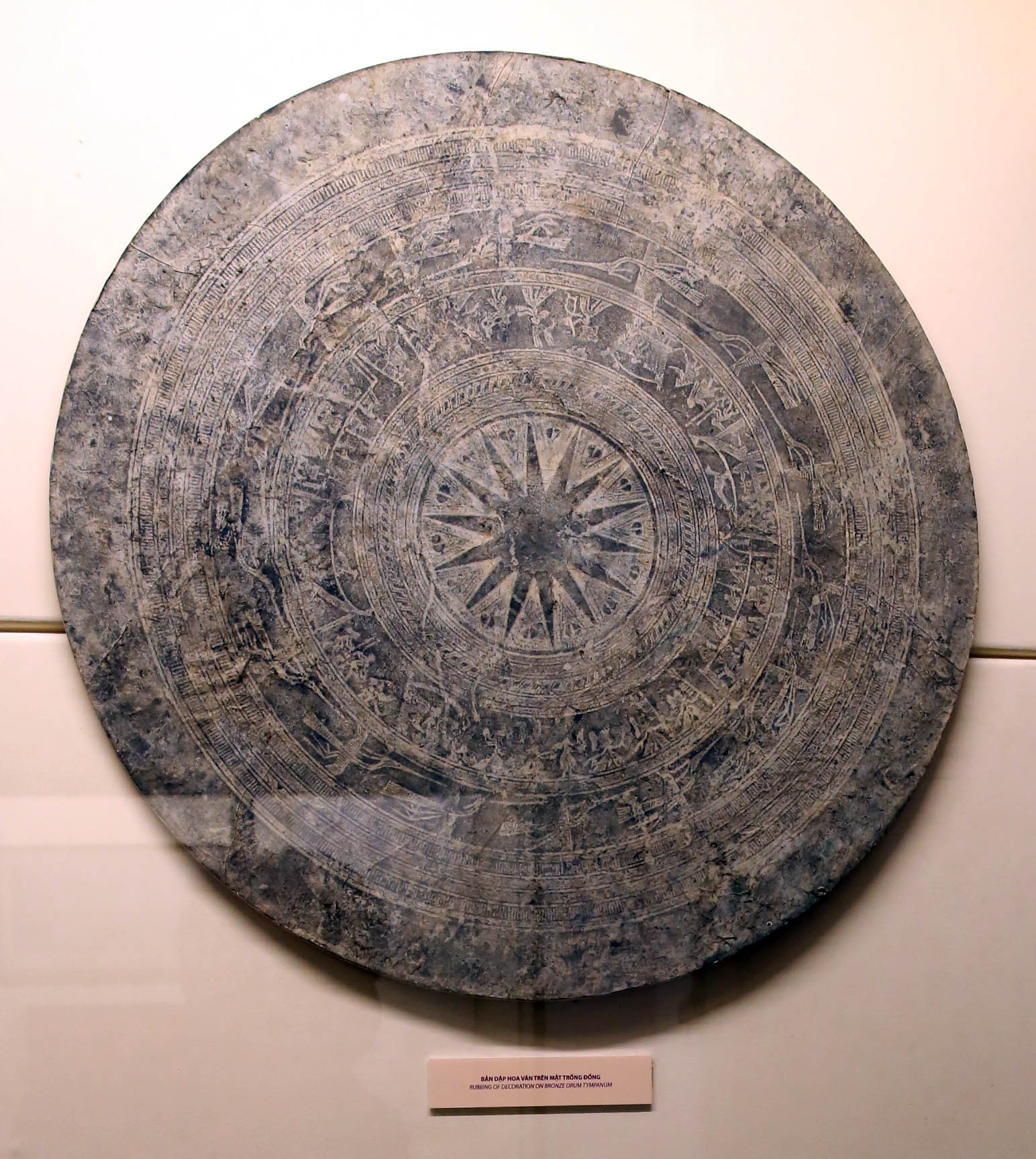 次の写真のように、胴鼓の上部を展示したものもあった。太陽を中心に、鳥や宗教儀式を行う羽根を付けた人々や生活のための船などが刻まれている。