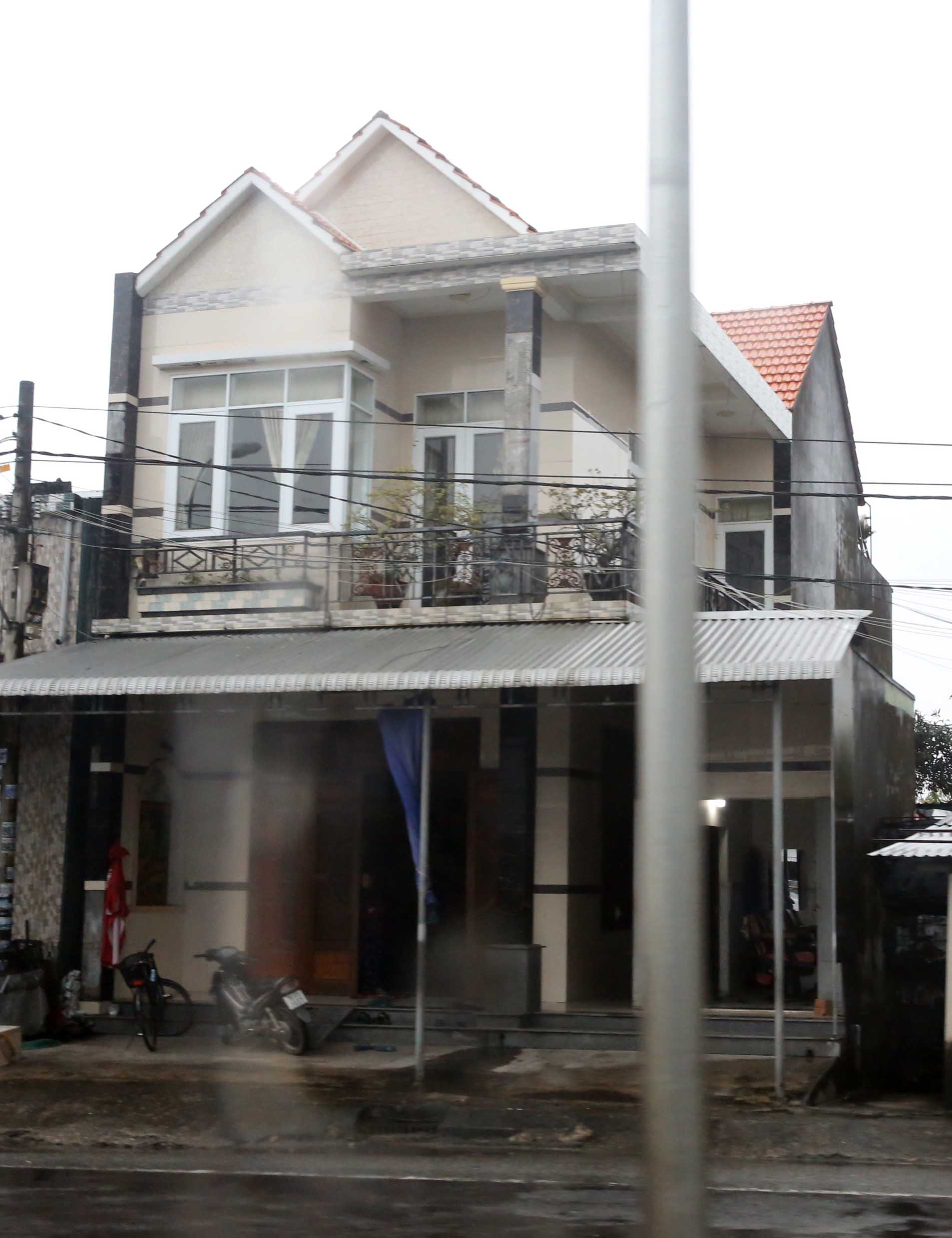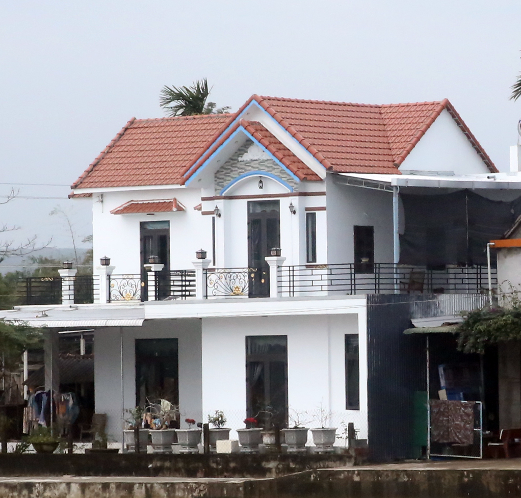 中部地方の農村では、大小の切妻造の瓦屋根を2~3、それも縦横に重ねる二階建ての家がよく見られた。ネット上でのいくつかの説明では、このような鋭い屋根の角度で、雨季の雨水をすばやく落とすための工夫ではないか、と言う。また、日本の九州でもこのように屋根を重ねて日除け対策をしている、と聞いたことがあるが、それぞれの説明はどうだろうか? ベランダも付けられているものがよく見られた。なお、いずれの写真も走る車内から撮ったものであることをお断りしておく。