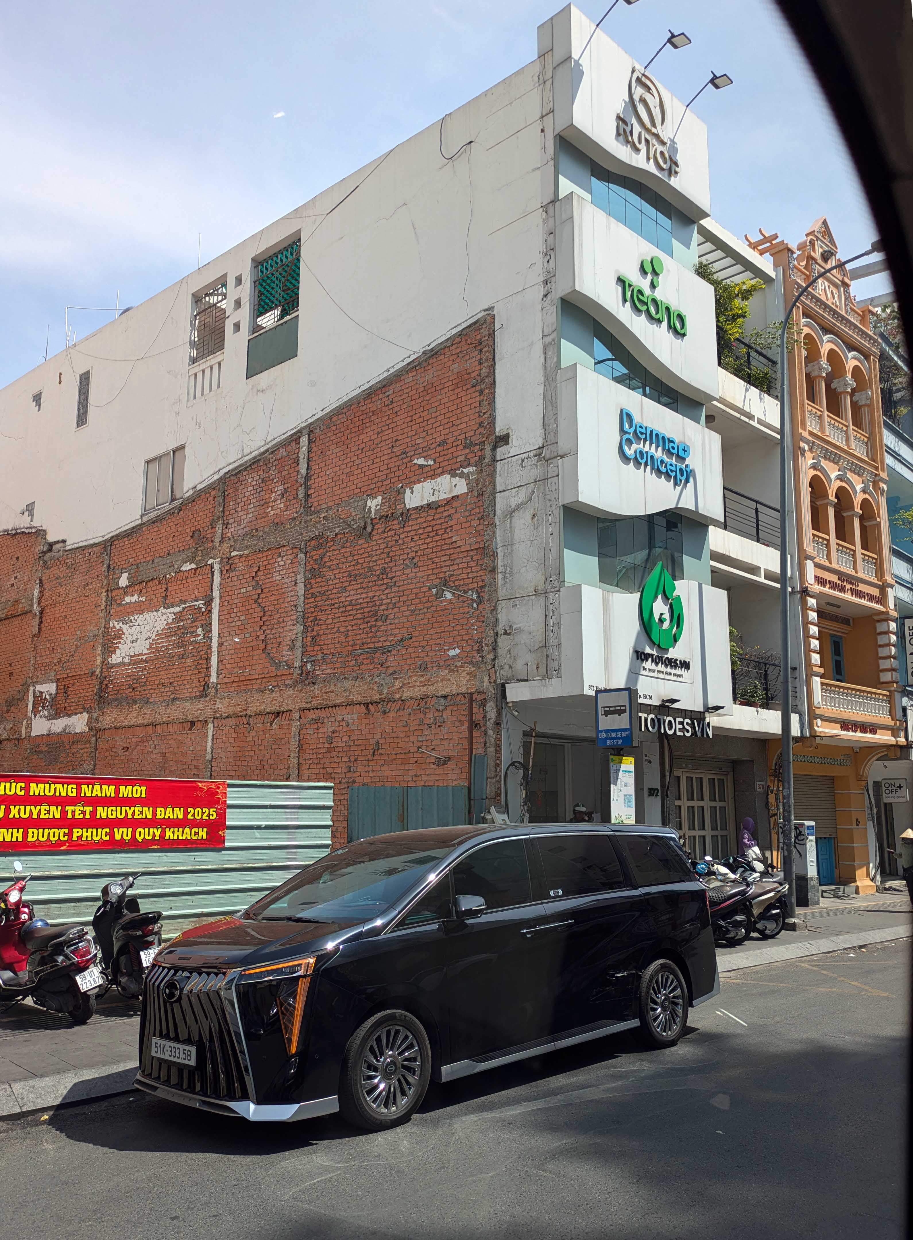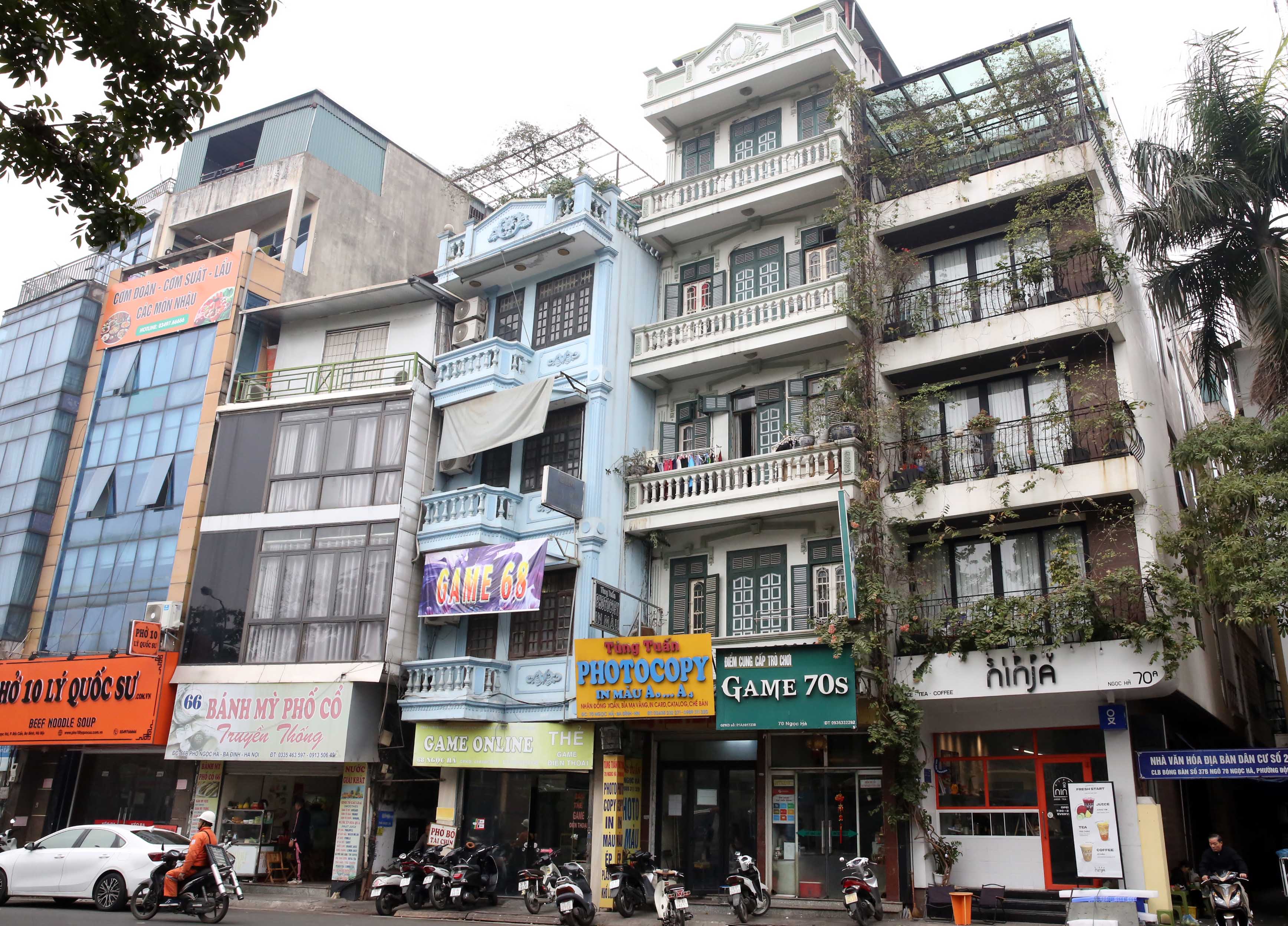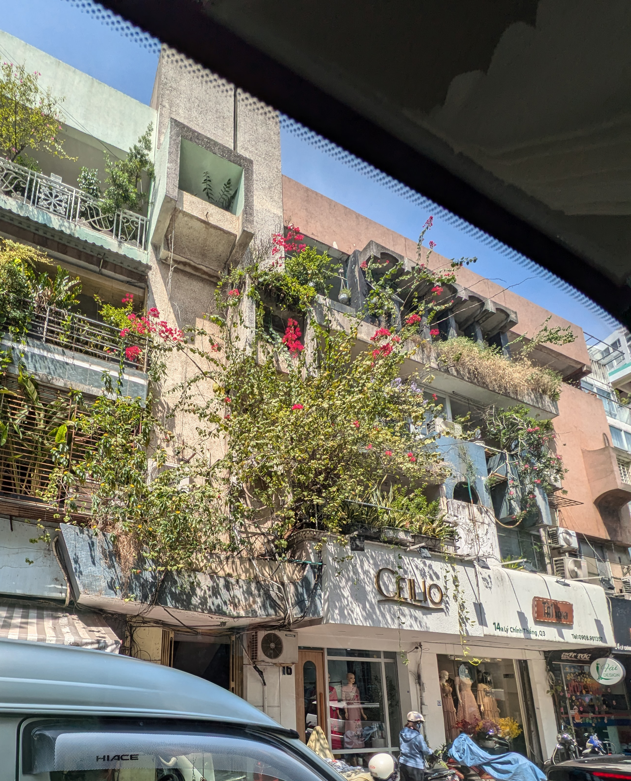 中には道路まで上からはみ出す木をベランダに出している家もある。ホーチミンにて。右は建物が煉瓦造りだと分るもの。