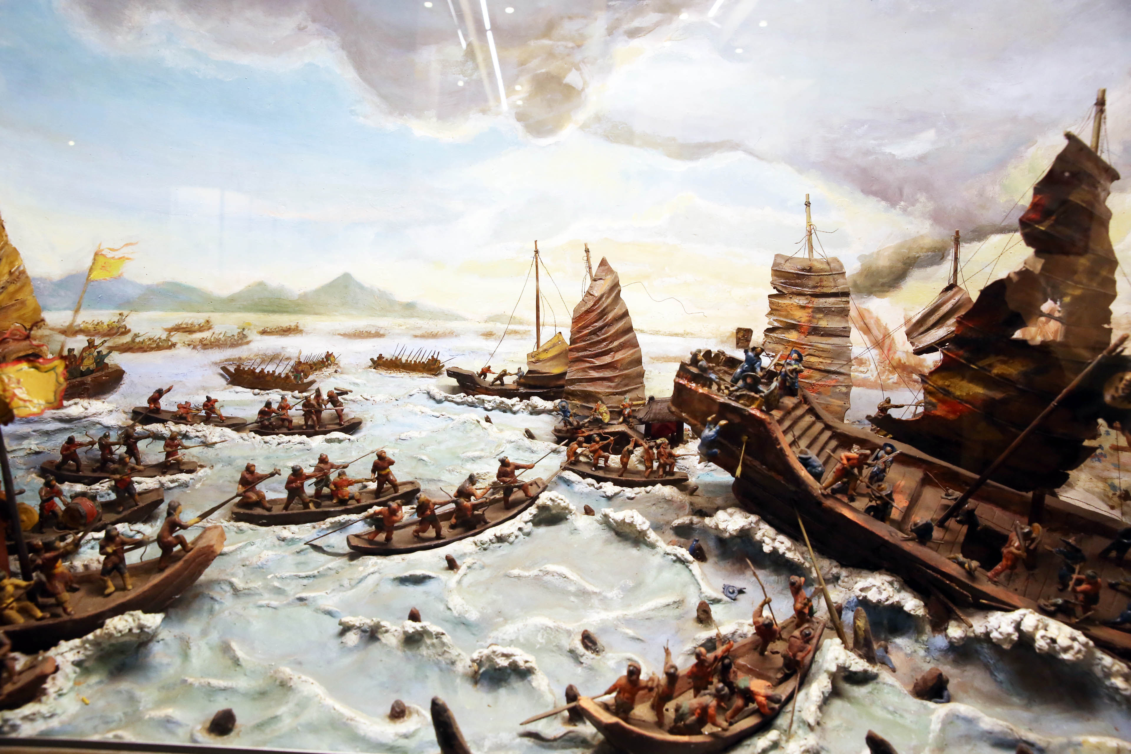 陳軍(赤旗)が白藤江で元軍(青旗)を川底に隠して打った杭で動きを止め、火攻めや小船で打ち負かしている図(国立歴史博物館)