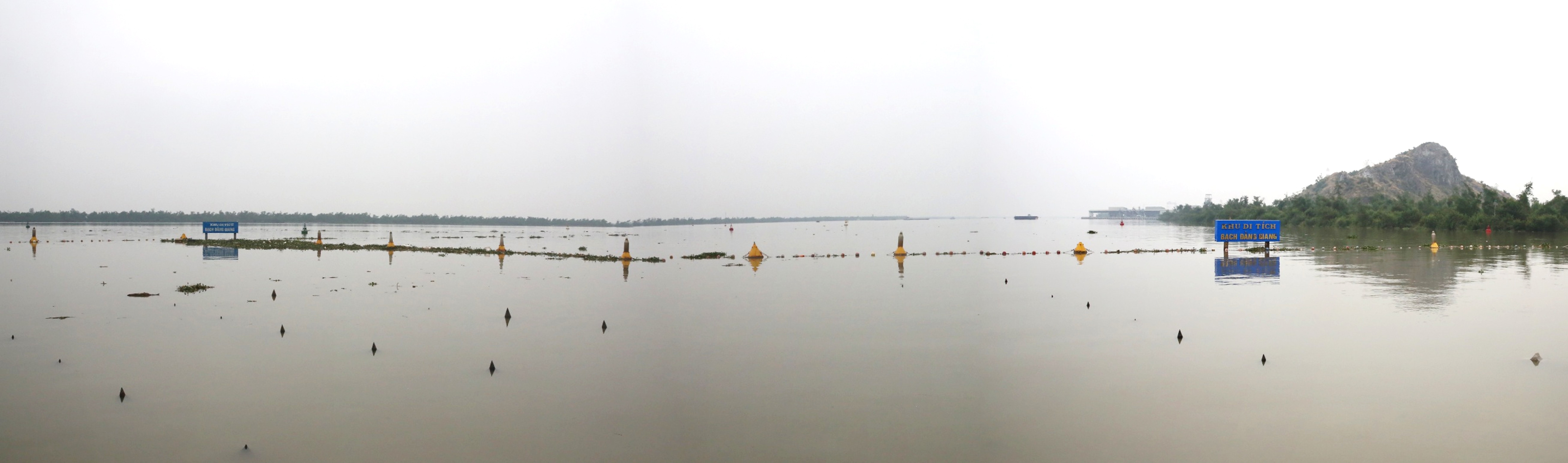 現在白藤江の戦いを記念する建物がある場所。右は、国立歴史博物館の戦いのジオラマ。左に黄色い「呉」の旗、川に打った杭、小船で南漢の大軍船と戦う呉の兵などが見られる。
