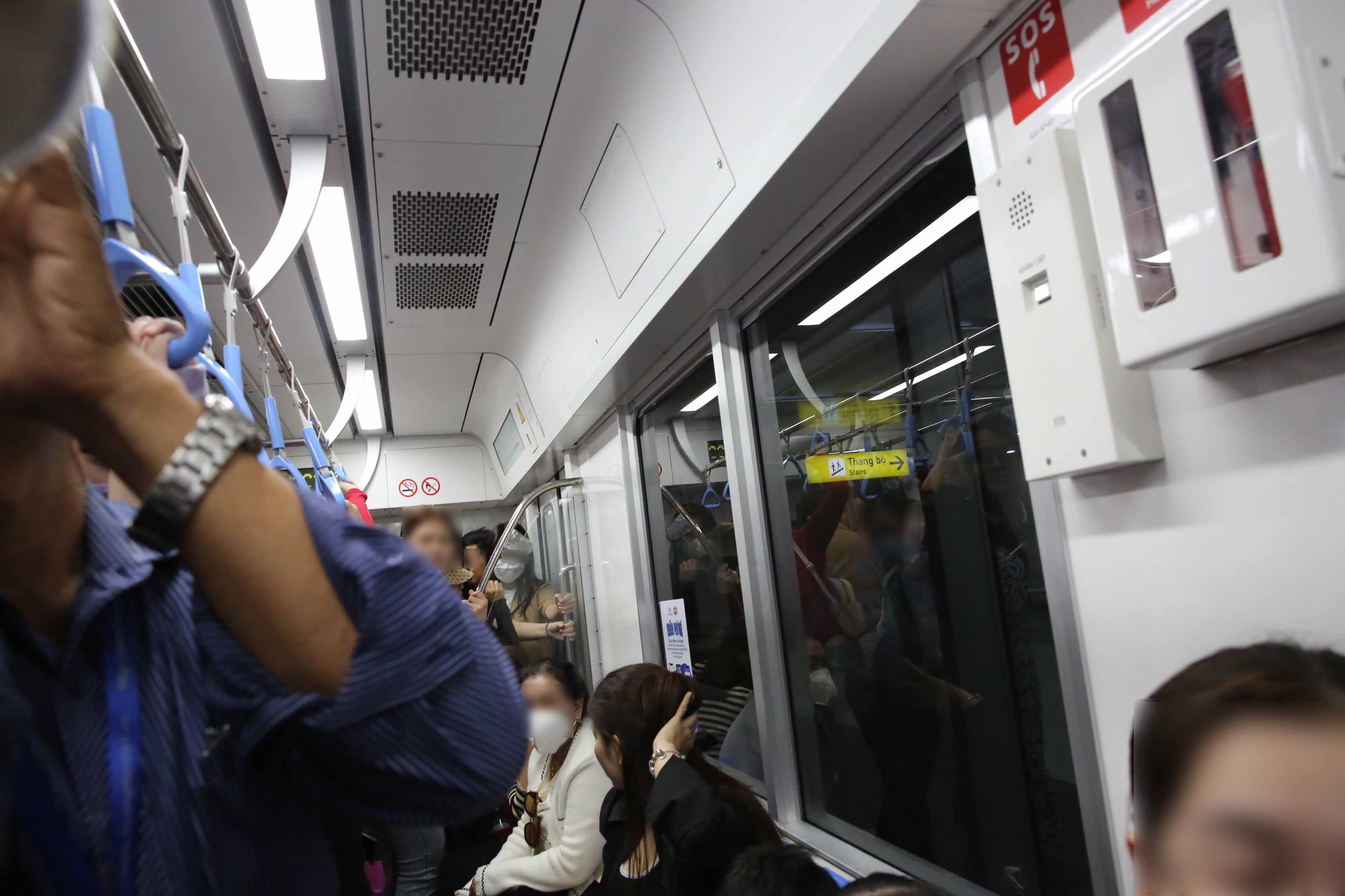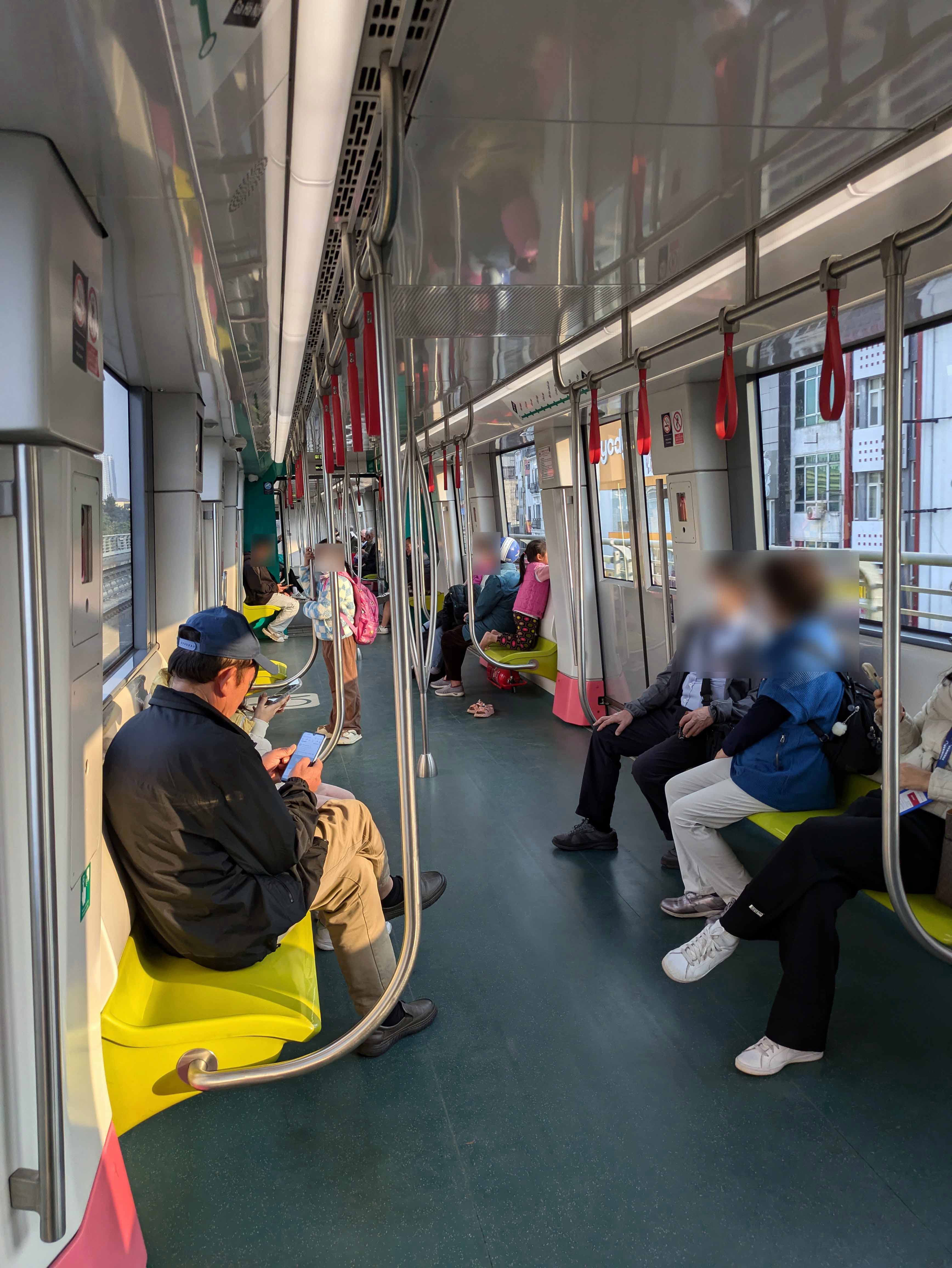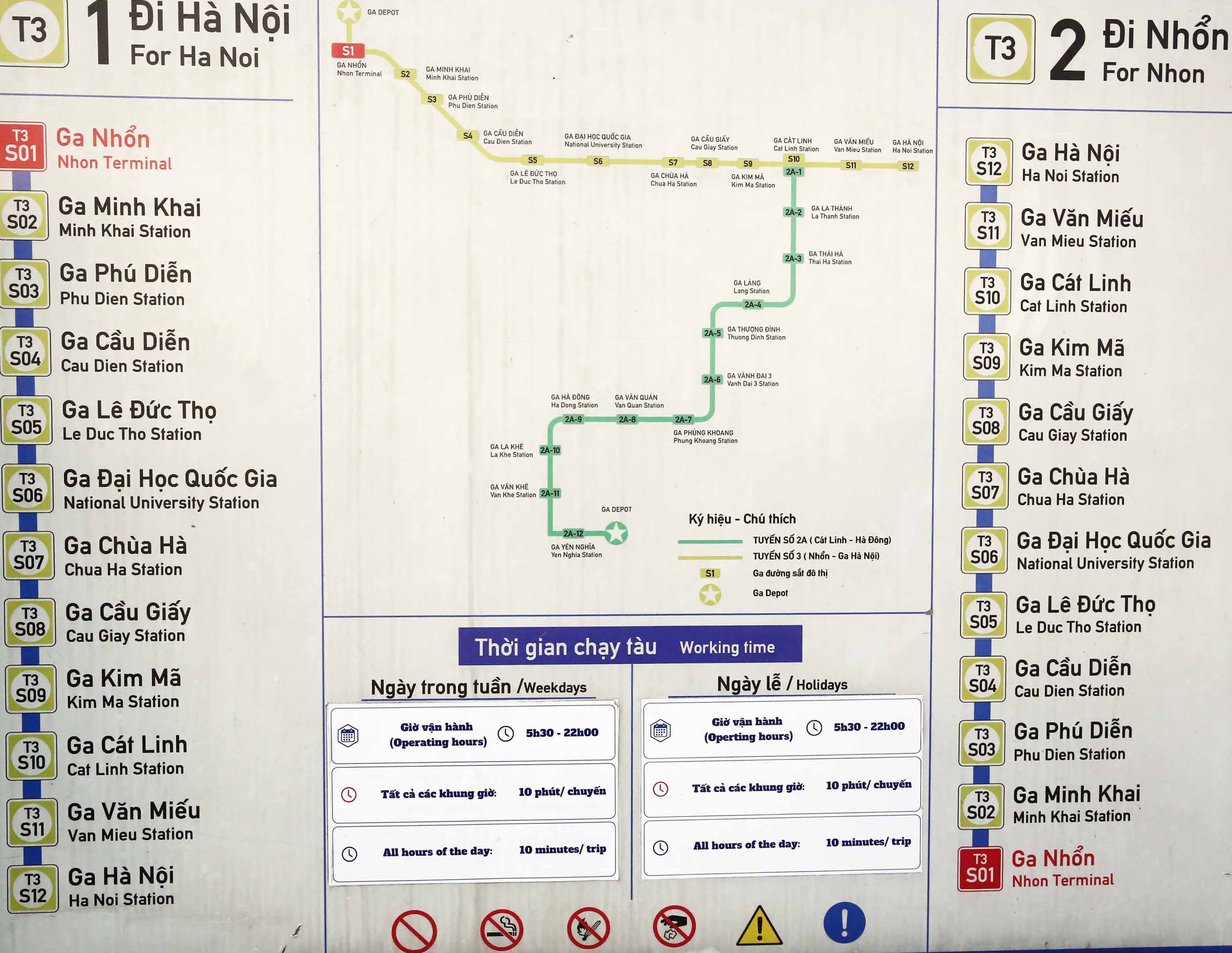 ハノイの高架鉄道の車内外の様子。退勤時でなかったためか空いていた。「ハノイメトロ」と呼ばれ、2025年1月時点で、2021年に開業した2A号線(カットリン線。緑色の路線図)と、2024年8月に開業した3号線(ヴァンミエウ線。薄鶯色の路線図)の2路線である。