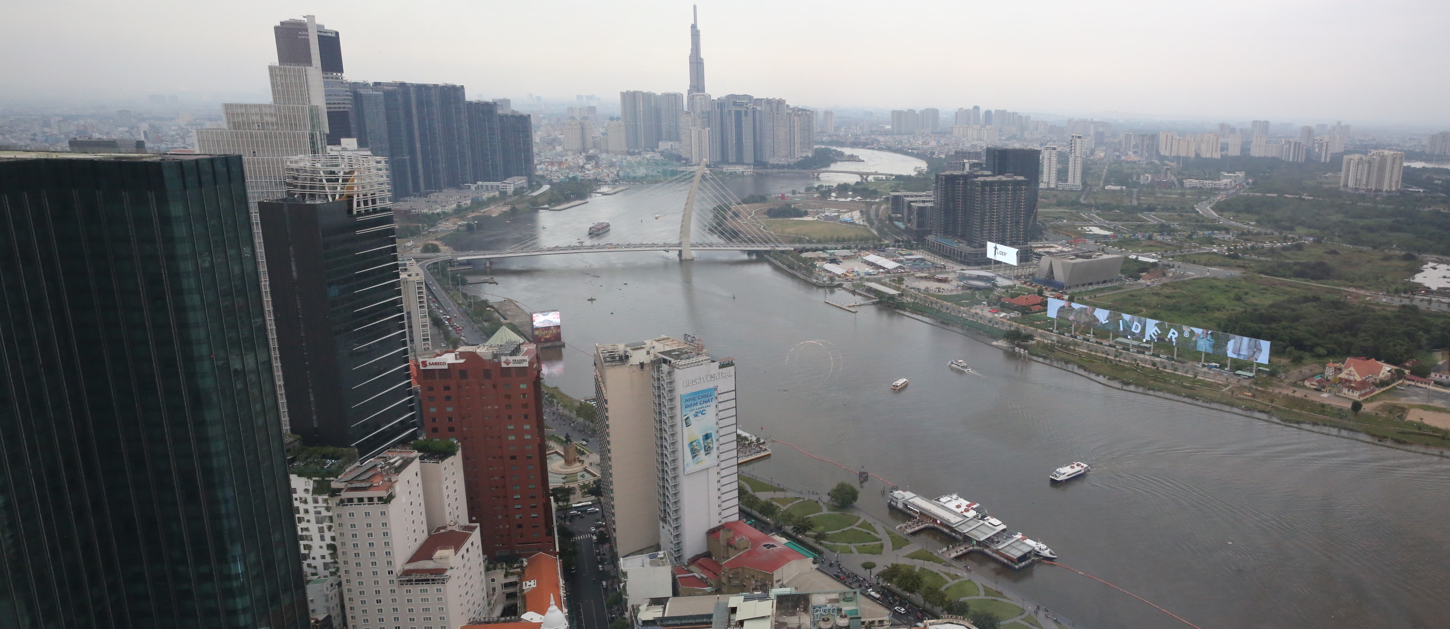 ビテクスコ・フィナンシャルタワー49階の「スカイデッキ」からサイゴン川と写真真ん中のバーソン橋(Cầu Ba Son)、ランドマーク81タワーを見る