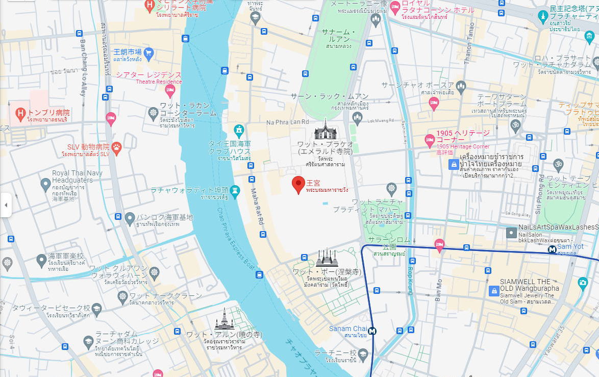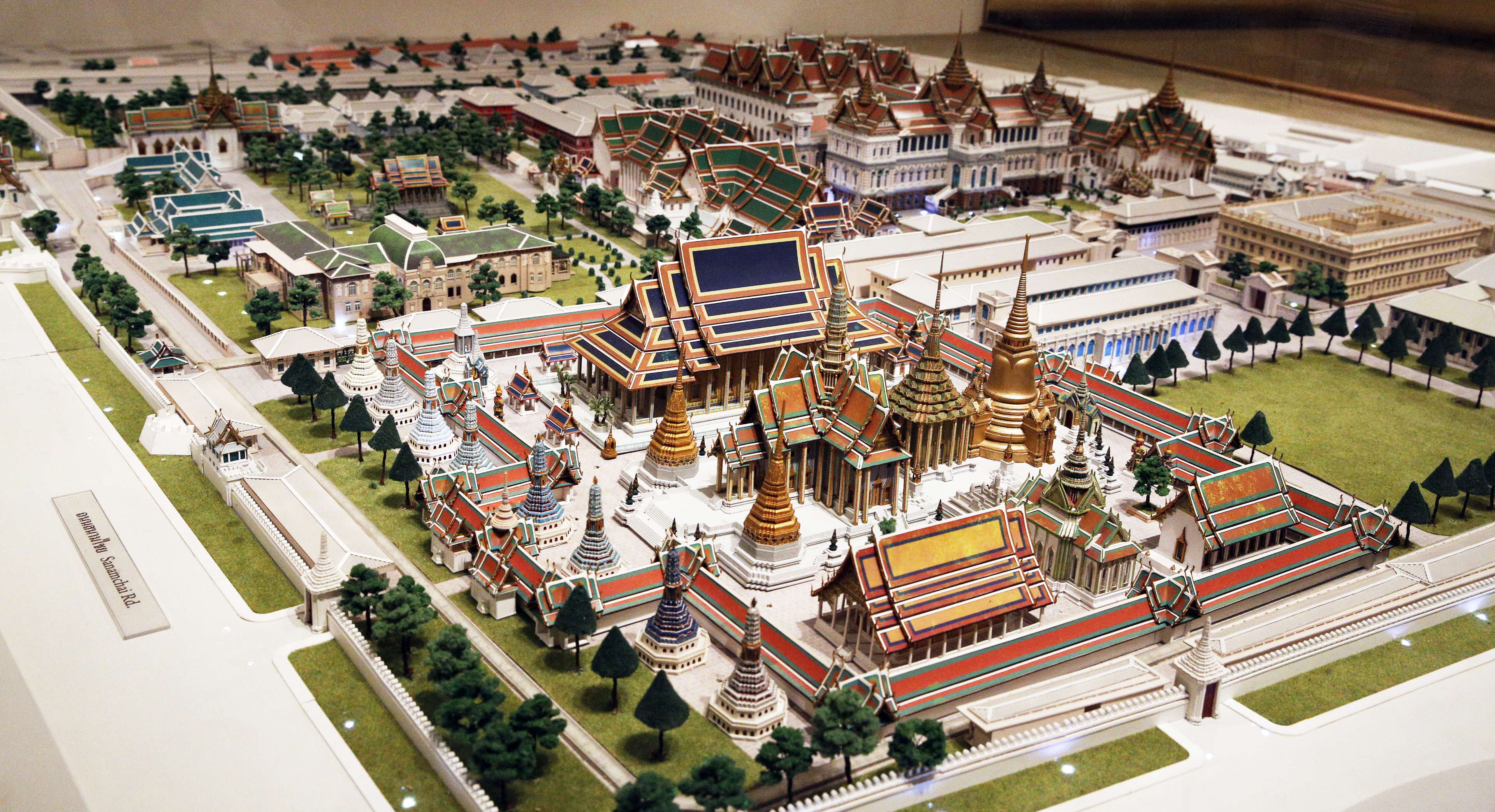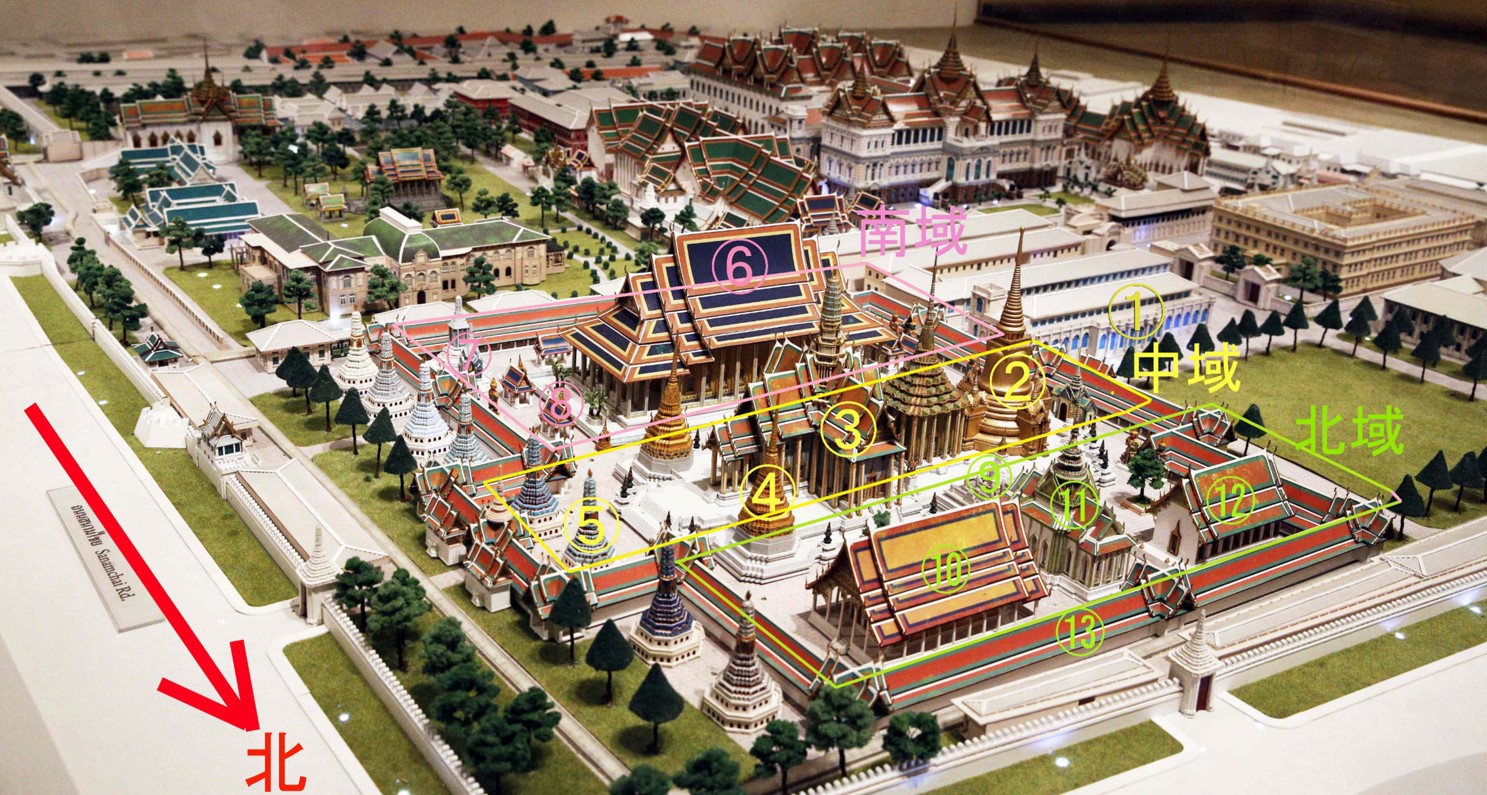 下に、タイの王家の寺院、ワット・プラケオと旧王宮の位置と、バンコク市内のラタナコーシン・エグビションホールという建物に展示されている精巧なそれらの模型を示す。ワット・プラケオは、本尊に「エメラルド仏」というタイ王国の守護仏を祀る、第一に尊い寺院であり、現チャクリー朝(ラタナコーシン朝)初代国王ラーマ1世が布薩堂(本堂)を建てエメラルド仏を安置した。以後、後を継いだ国王たちが建物(伽藍)を次々と建て増ししたり改築した。