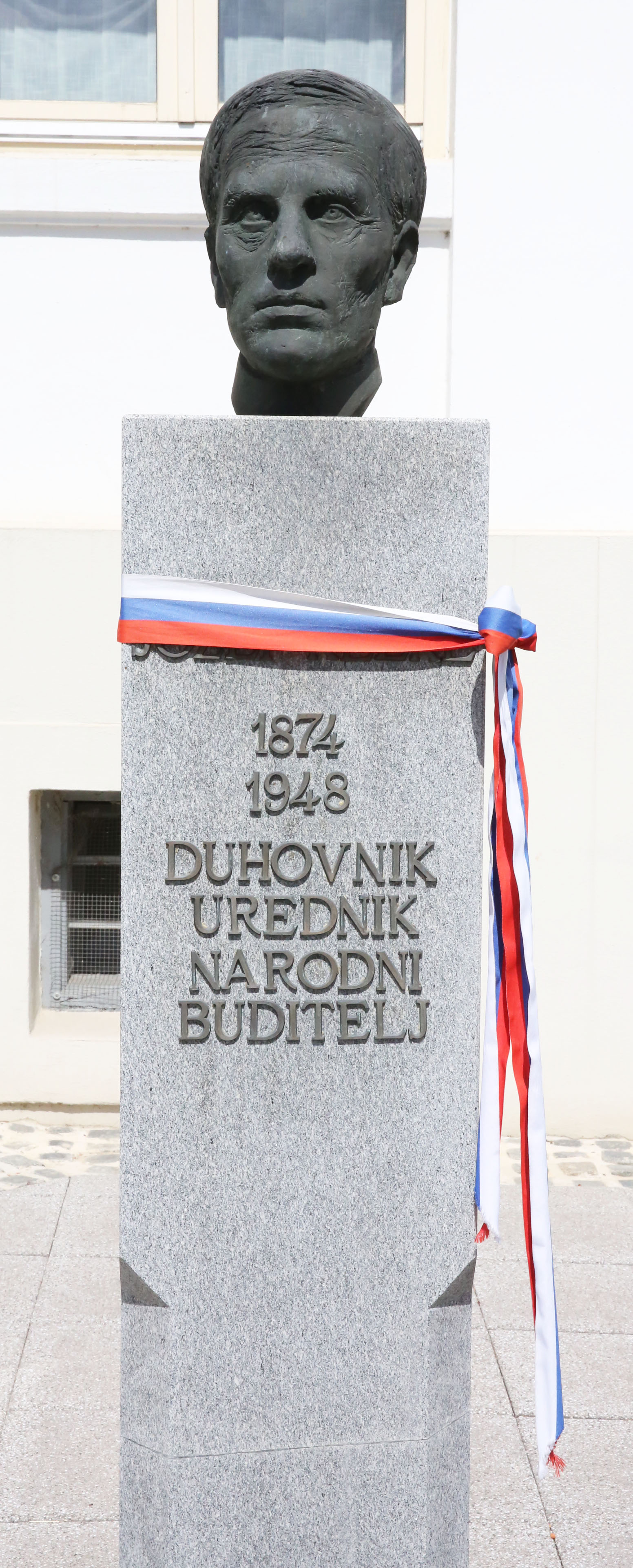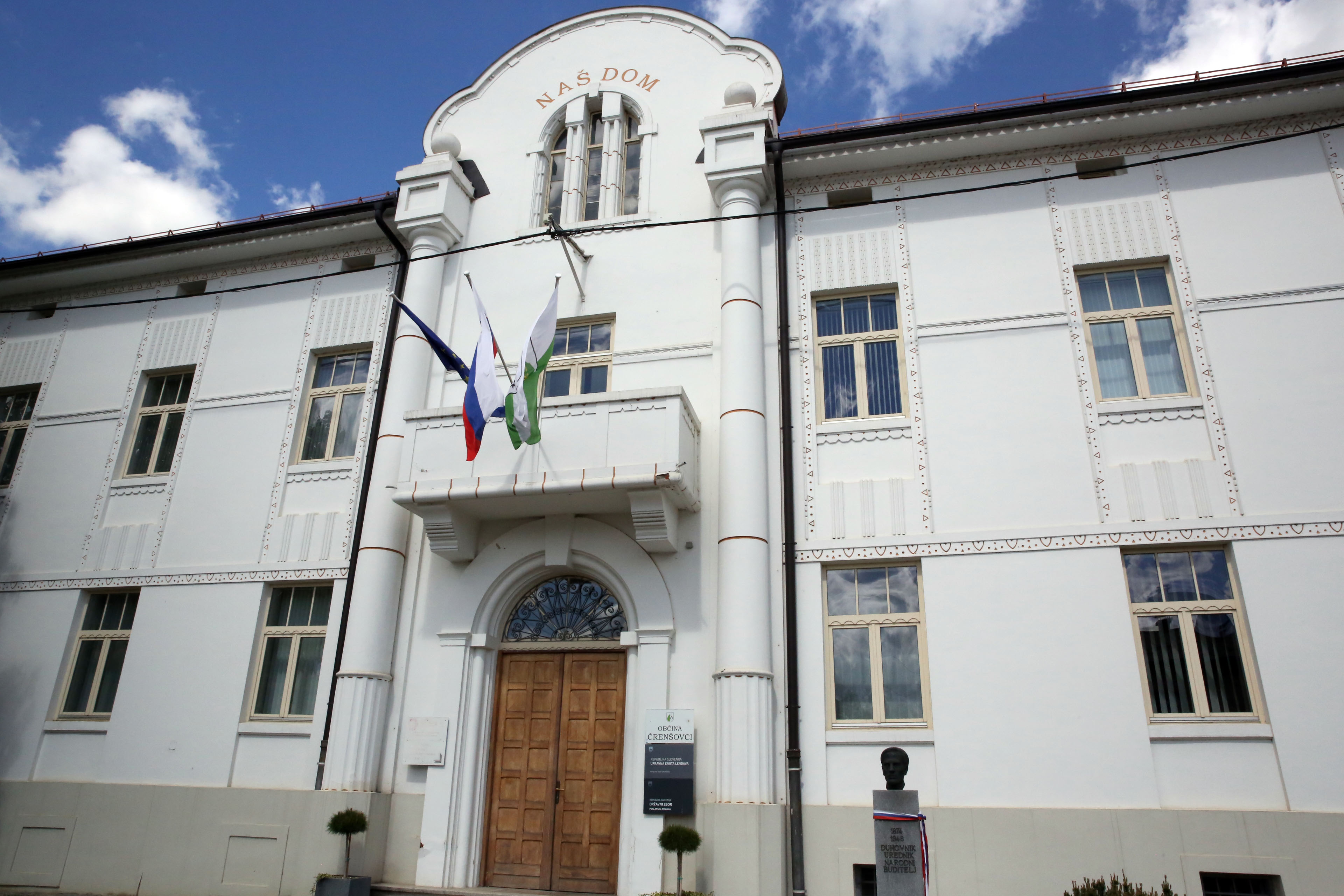 チュレンショフティの市庁舎。その前にヨジェフ・クレクル像が置かれている。