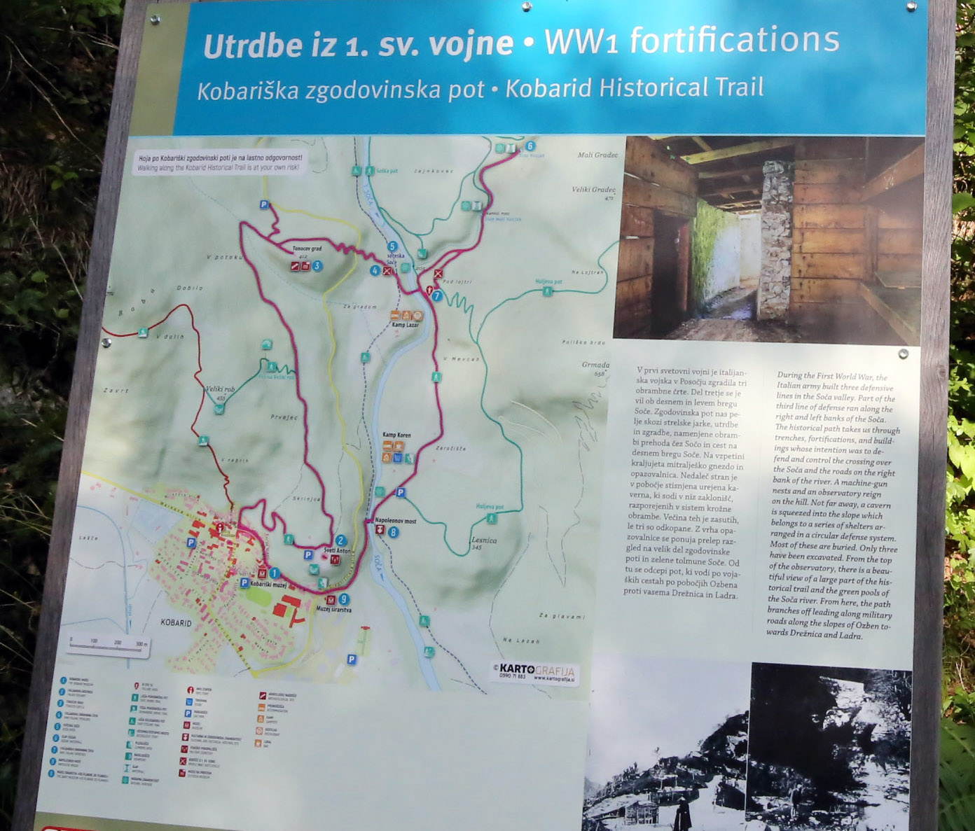 これは、戦争の記憶を自然とともに歩いて学ぶ場として整備されているコバリドの「歴史の道」の中の一つで、上の写真のバンカーは地図中の7番にあたる。
