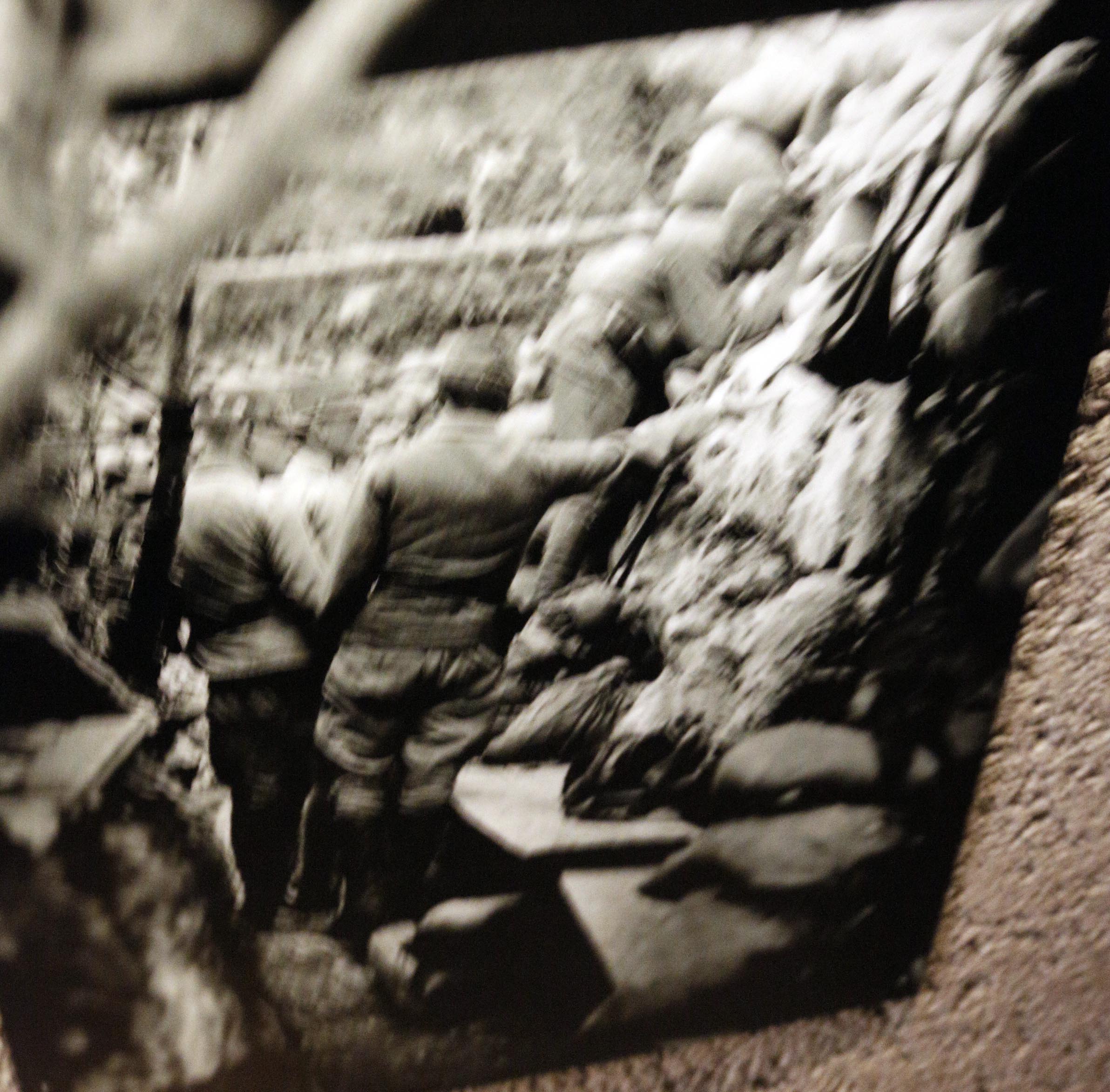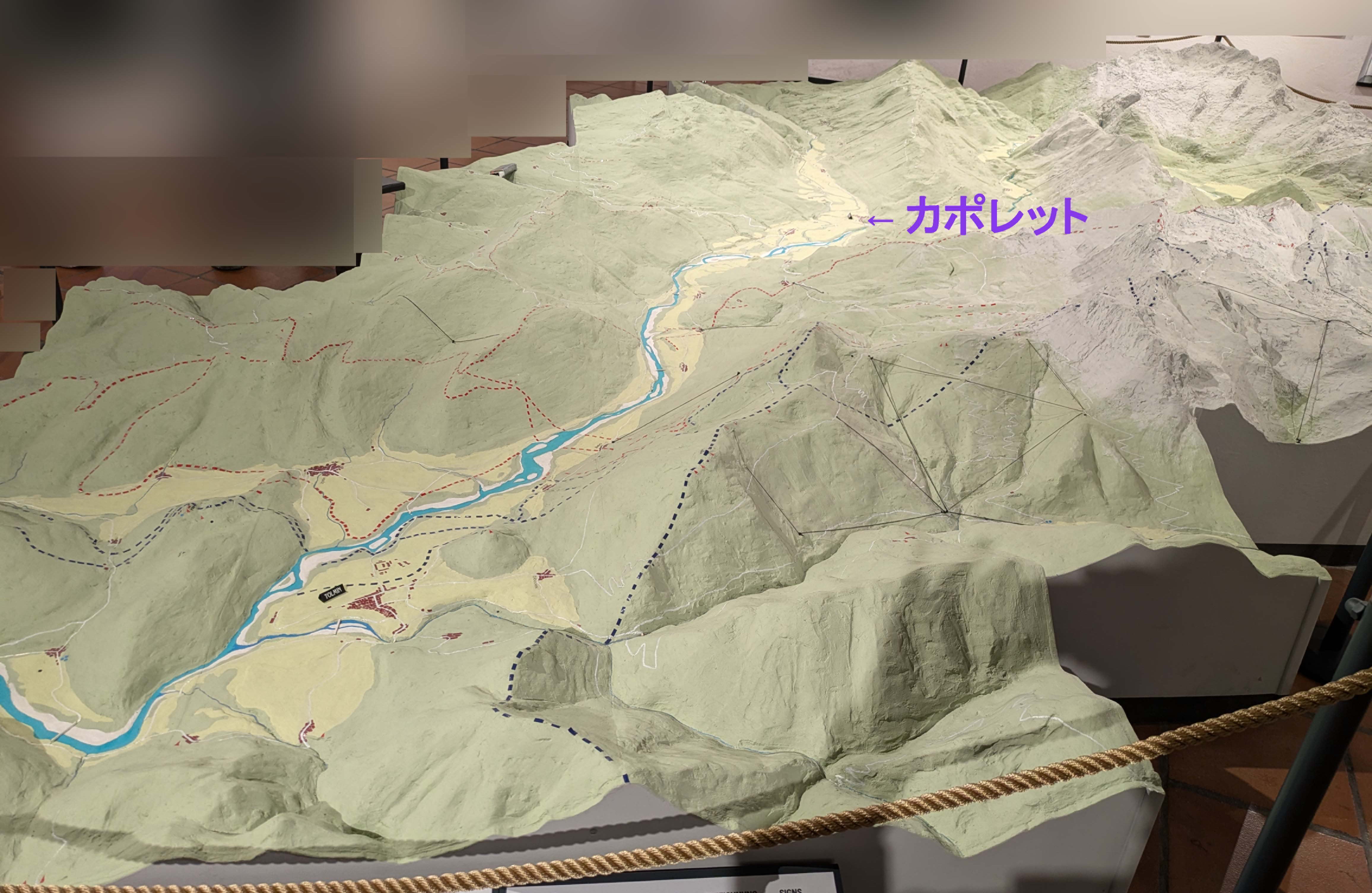 この戦場のジオラマは、コバリド博物館のものだが、赤い線でイタリア軍の塹壕を、青い線でオーストリア軍の塹壕を示している。