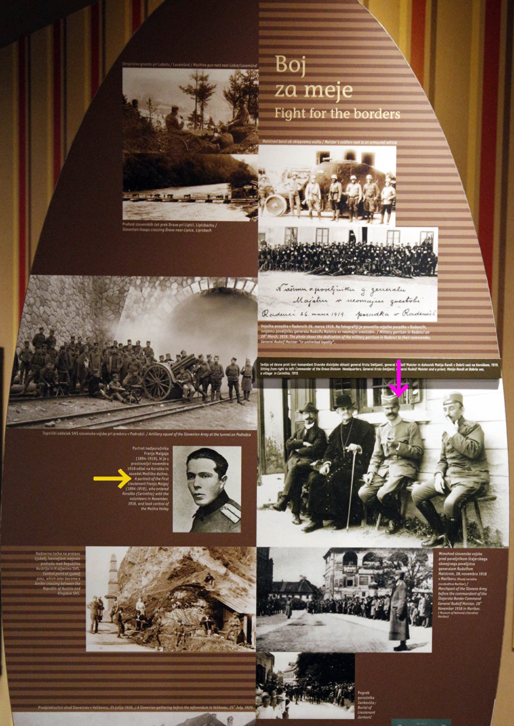 ただ、この確定には、スロヴェニアの軍事行動があった。オーストリア帝国の崩壊で新たな国境が未確定な中で、シュタイヤーマルクのマリボルと近辺はオーストリアが領有を宣言したが、スロヴェニア人のRudolf Maisterルドルフ・マイスターを司令官とする部隊はこの地を制圧した。また、Franjo Malgajフランヨ・マルガイの部隊は、ケルンテルンのメジャ川渓谷でオーストリア軍と戦い占拠したが、彼は戦死した。リュブリャナの近現代史博物館にはその展示がある。展示写真の中のピンク↓がマイスター将軍。黄色→がマルガイ