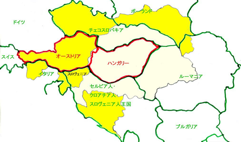 戦後、オーストリアの処置が決められたサン・ジェルマン・アン・レー条約、ハンガリーの処置が決められたトリアノン条約で、両国の領土は大幅に割譲され、「民族自決」の原則により、新たなポーランド、チェコスロバキア、セルビア人・クロアチア人・スロヴェニア人王国(次のページ参照)などが誕生した。また、戦勝国イタリアは、南チロル、イゾンツォ川流域、トリエステ、イストラ半島など「未回収のイタリア」を回収した。次の地図内の黄色の部分は旧オーストリア領、アイボリーが旧ハンガリー領、赤い国境が、新たなオーストリア、ハンガリーの国境、緑の国境で示したのは、新しい独立国など他の国のものである。