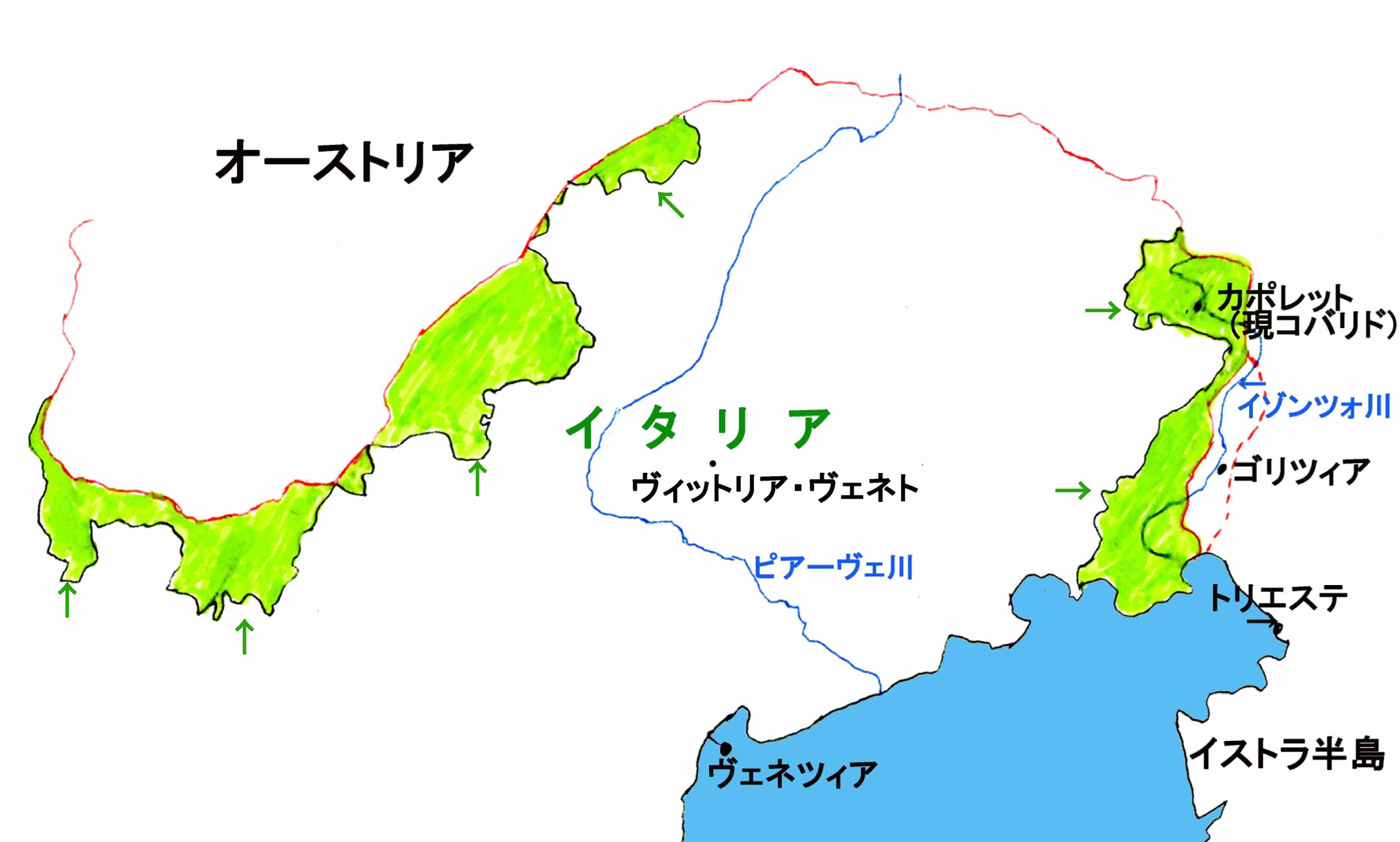 イゾンツォというのは、イゾンツォ川、スロヴェニア語ではSoča ソチャ川のことで、現在のスロベニア西部からイタリア北東部にかけて流れる川であり、流域のほぼ全域が当時はオーストリア領であった。イタリアは、この流域を、イタリア領になっていないがイタリア語話者が多く住む、本来はイタリア領にならねばならない「未回収のイタリア」、の一部だとして、この奪取をオーストリアとの戦争をする目的としていた。さらにイタリアは、その先のオーストリア領のトリエステ、イストラ半島も、そして南チロル地方も「未回収のイタリア」として奪取を狙っていた。イタリアは当初は戦争に対し「中立」の立場を示していたが、イギリス側と「未回収のイタリア」獲得の密約が成ると、1915年5月から6月にかけて、イゾンツォ川流域や南チロル地方のオーストリア軍が手薄だったところに電撃的な攻撃をかけ、下の地図の黄緑色の地域を占領した。